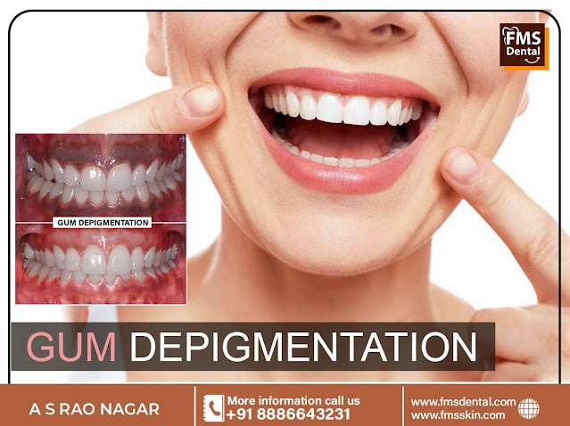 FMS Dental Hospital is the best dental clinic in hyderabad for LASER Gum depigmentation treatment in Hyderabad. FMS International Dental Center possesses diode lasers and Nd:YAG Lasers which are the most preferred for gum depigmentation procedure. These Lasers penetrate in to the melanocytes and reduce the production of melanin in the gingival tissue. Chances of relapse are less with the use of lasers which results in a lighter and more uniform colour to the gums. Usage of LASERs enhances the final outcome and prognosis in a long-term.